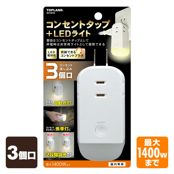 トップランド(TOPLAND) 3個口 コンセントタップ&LEDライト (合計1400Wまで) M7410 非常灯 防災 地震 コンセントタップ 電源 たこ足 タコ足 3口タップ 3個口タップ 電源タップ